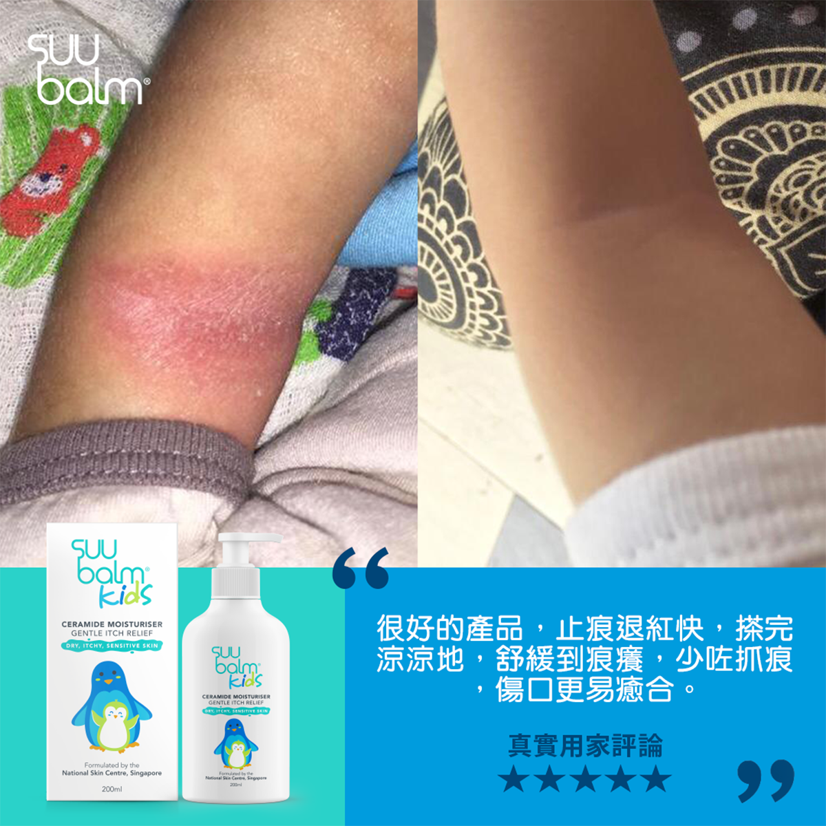 Formulated with high-quality ingredients specially for your little one's delicate skin - Suu Balm Kids Dual Rapid Itch Relieving and Restoring Ceramide Moisturiser contains cooling menthol that relieves itch fast, and 3 types of skin-identical ceramides to moisturise dry, itchy, sensitive and eczema-prone skin. With a premium formula that is steroid-free, preservative-free and fragrance-free, this gentle moisturiser is suitable for newborns and up, giving your child a good night's sleep without scratching!